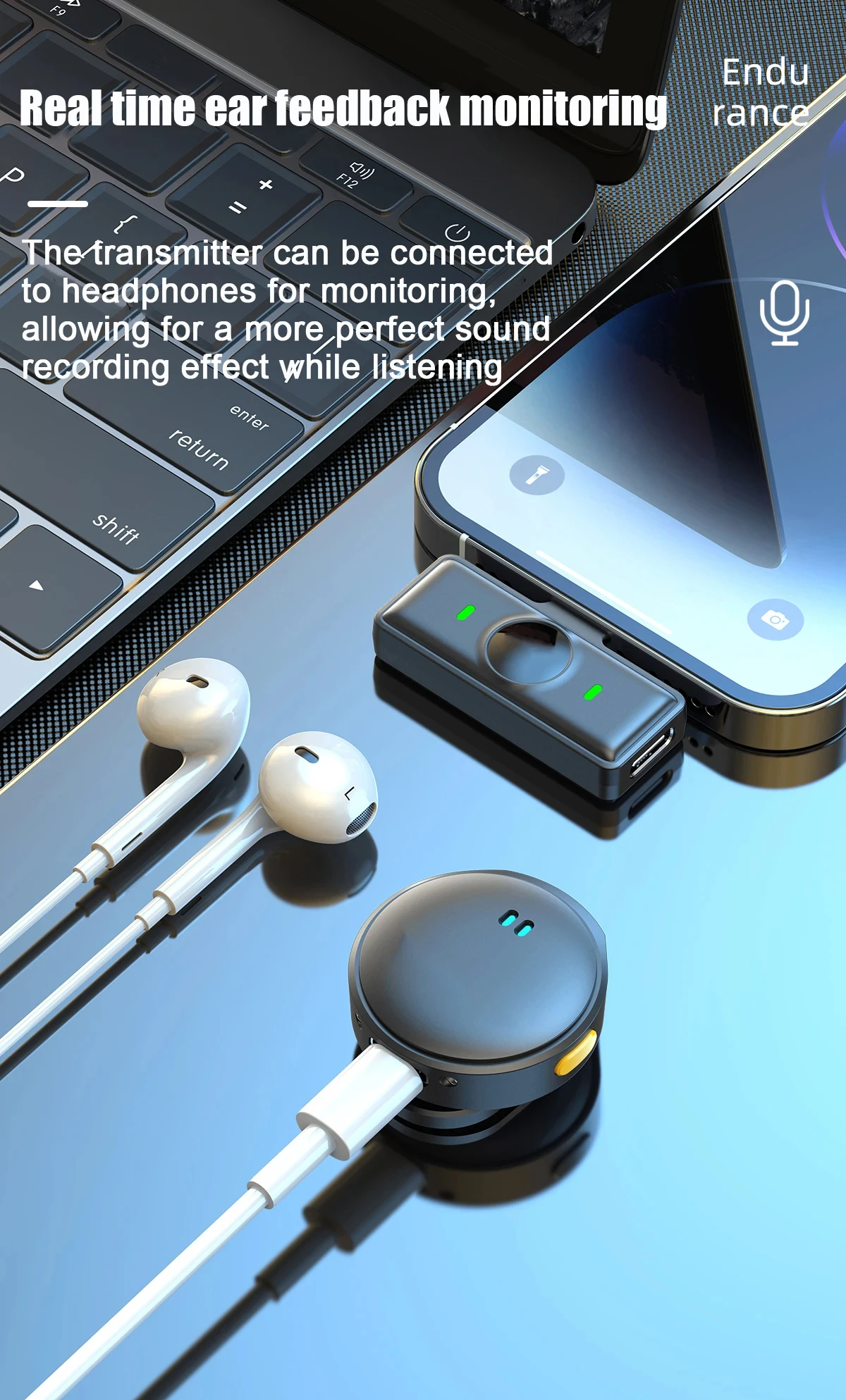 O transmissor Sthe pode ser conectado a fones de ouvido para monitoramento, permitindo um efeito de gravação de som mais perfeito durante a audição